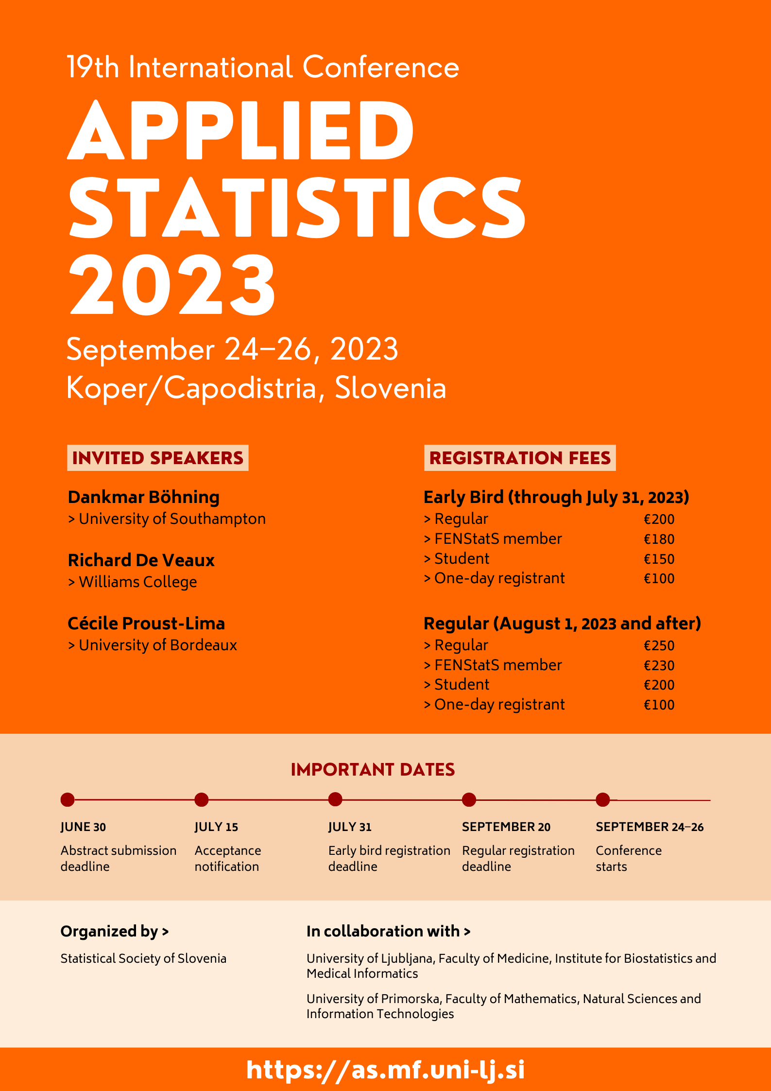 We are pleased to announce that the 19th Applied Statistics 2023 will be held in Koper/Capodistria on September 24‒26, 2023. The event will be hosted by the Faculty of Mathematics, Natural Sciences and Information Technologies of the University of Primorska. For more information and to submit abstracts, visit https://as.mf.uni-lj.si.
